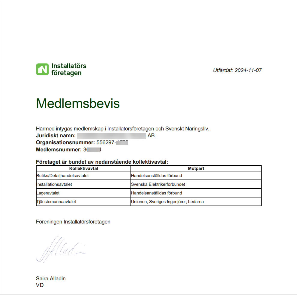 Idag kan du enkelt ladda ner ditt företags medlemsbevis under "Mina sidor". För att underlätta för dig som medlem innehåller medlemsbeviset nu alla kollektivavtal som ditt företag tecknat, inklusive respektive motpart.