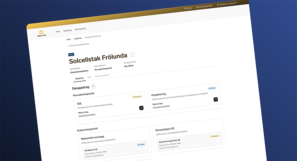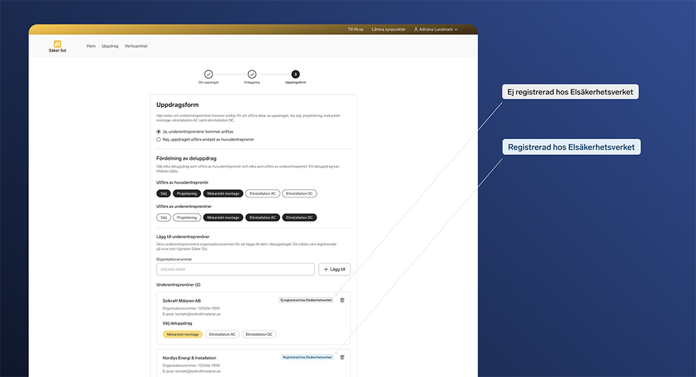 Rätt kompetens och resurser är avgörande för en kvalitetssäkrad installation. I tjänsten Säker Sol lägger du enkelt till underentreprenörer för de olika deluppdragen sälj, projektering, mekaniskt montage, elinstallation DC och elinstallation AC. Alla entreprenörer som ska utföra elinstallationsarbete kontrolleras automatiskt mot Elsäkerhetsverkets register.