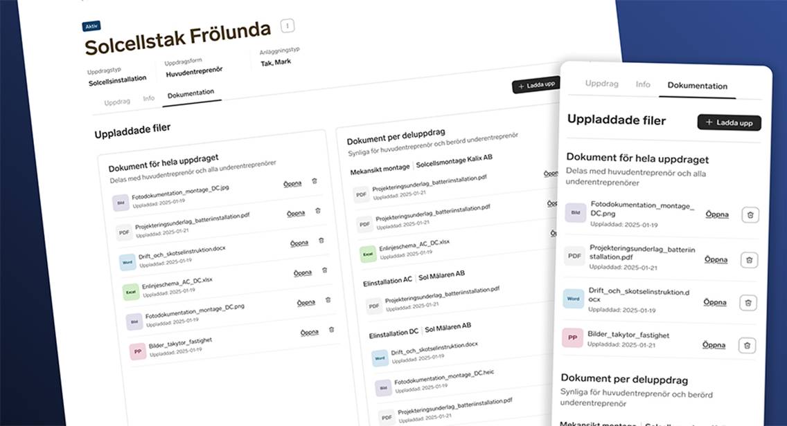 Entreprenörer från samtliga deluppdrag kan ladda upp dokument direkt i uppdraget. Huvudentreprenören styr sedan vilka dokument som ska vara gemensamma. När alla kontroller är granskade och klara skapar huvudentreprenören uppdragsbeskrivning och ett unikt intyg redo att skickas till slutkund. Smidigt och enkelt direkt från tjänsten.
